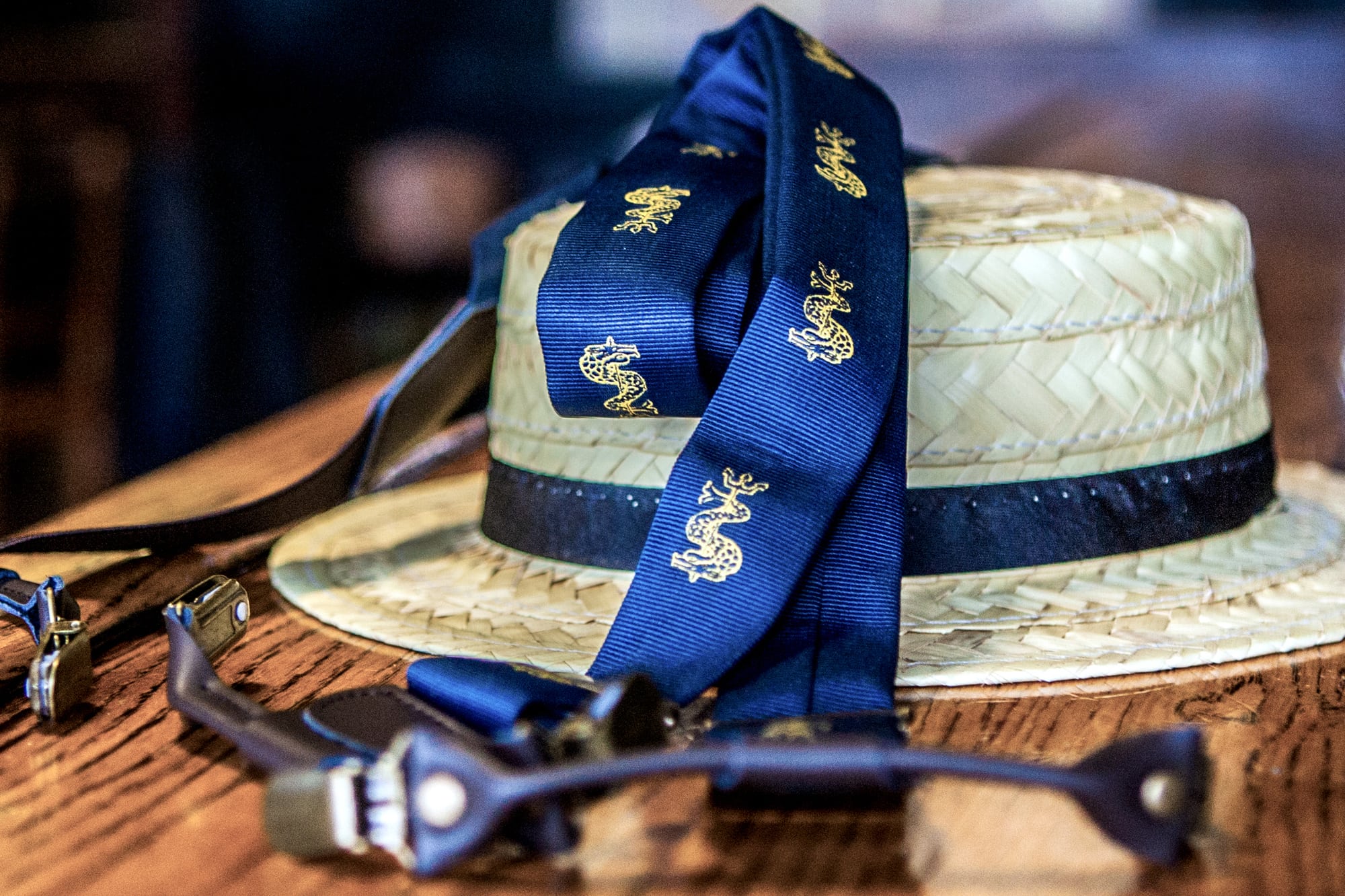 €34,95 Bretels Klassiek “Varsity” item Donkerblauw met gele Jutphaas Bruin leer Koperen gespen Bekijk product
